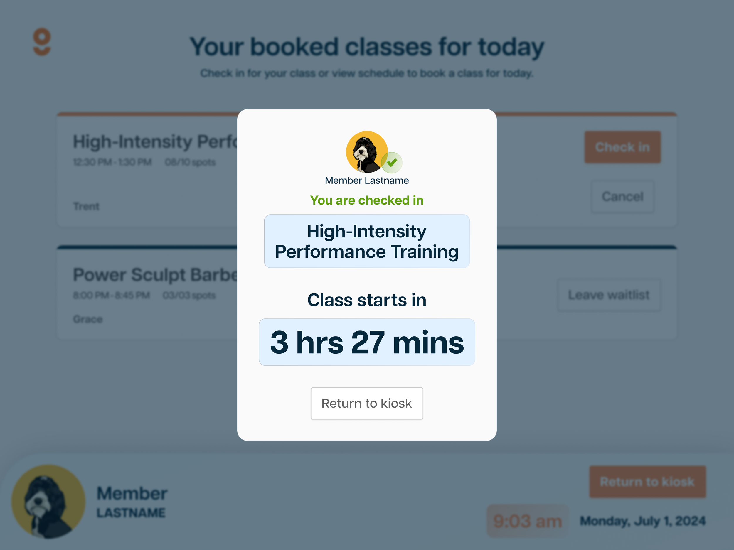Personalized avatar check-in screen, allowing members to tap their profile and view booked classes