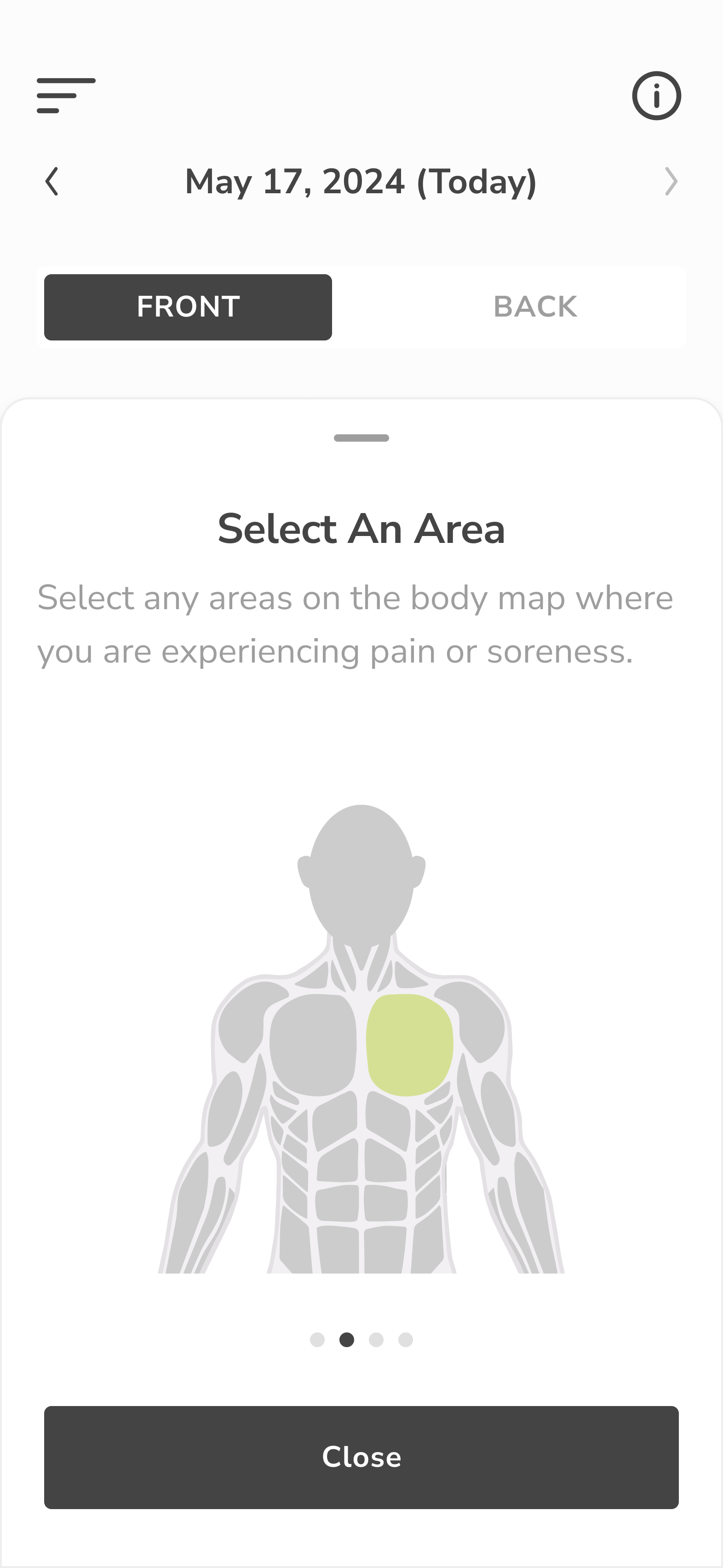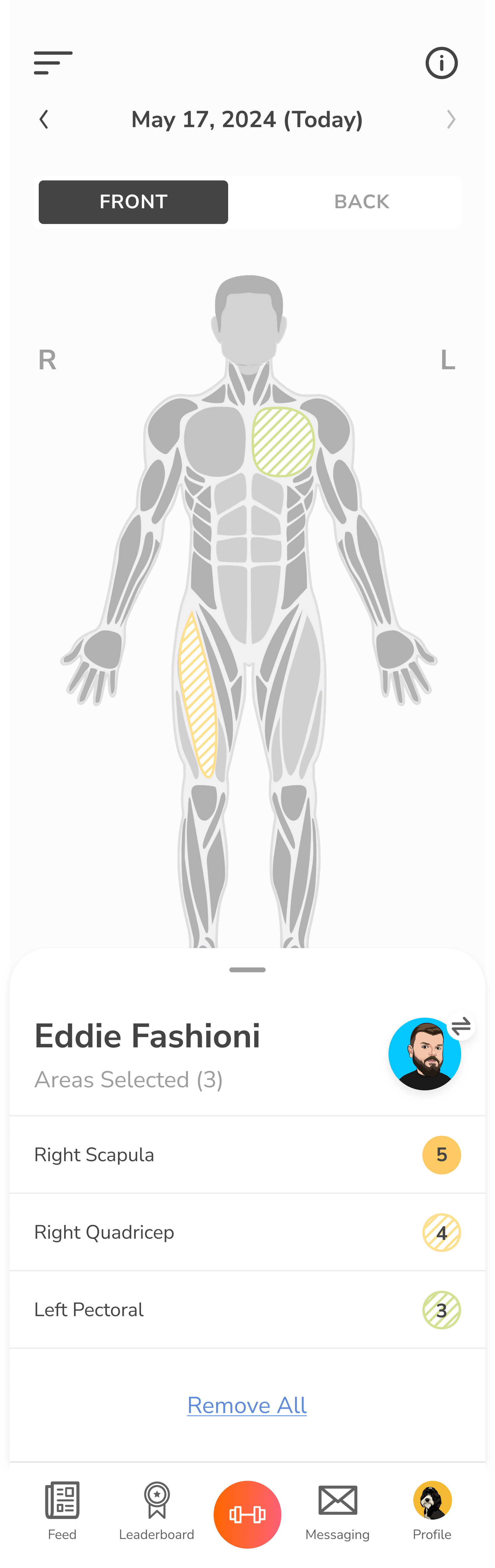 Interactive anatomical model with front/back toggles and region-based reporting (e.g., left quad, right scapula)