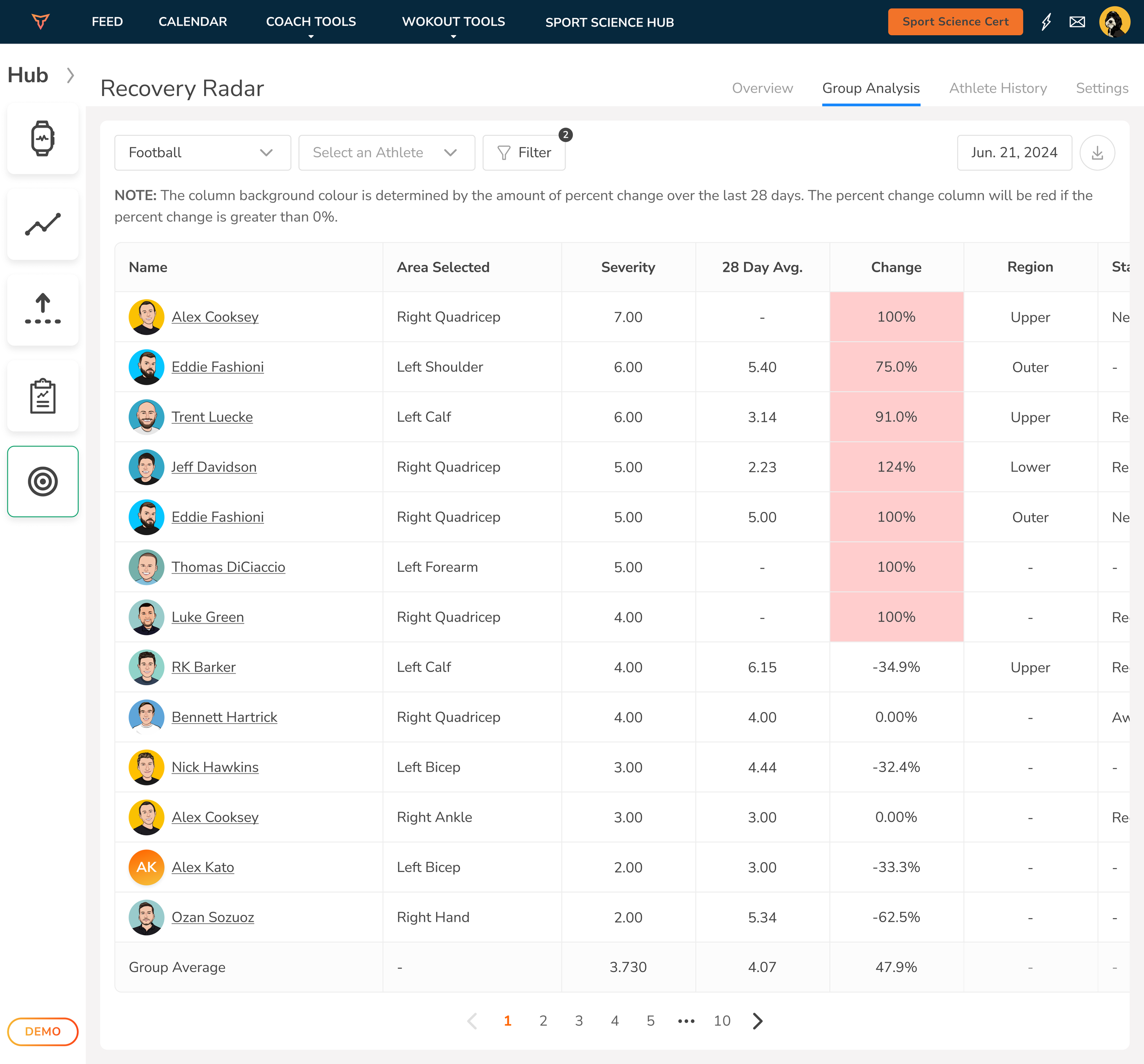 Views for Overview, Athlete History, and Group Analysis allowing coaches to compare changes over time and act early