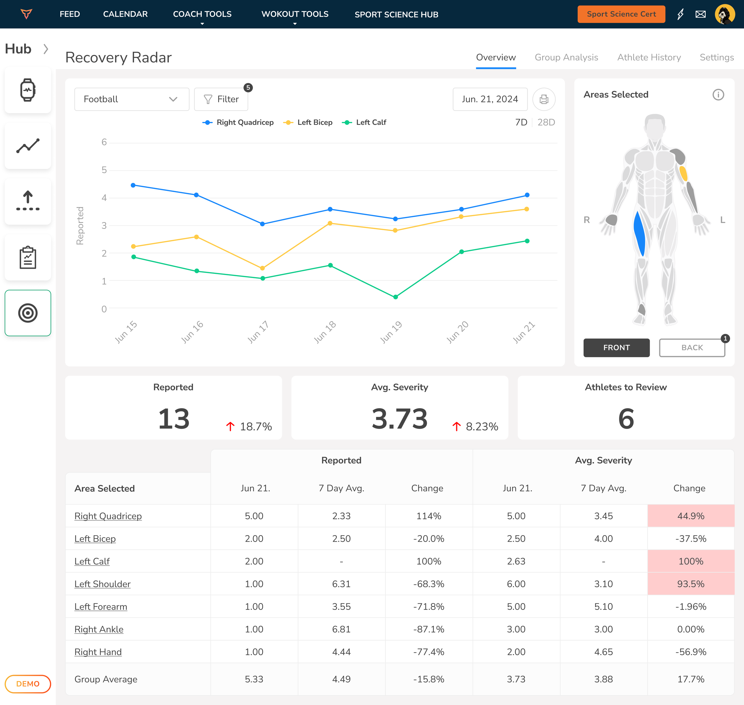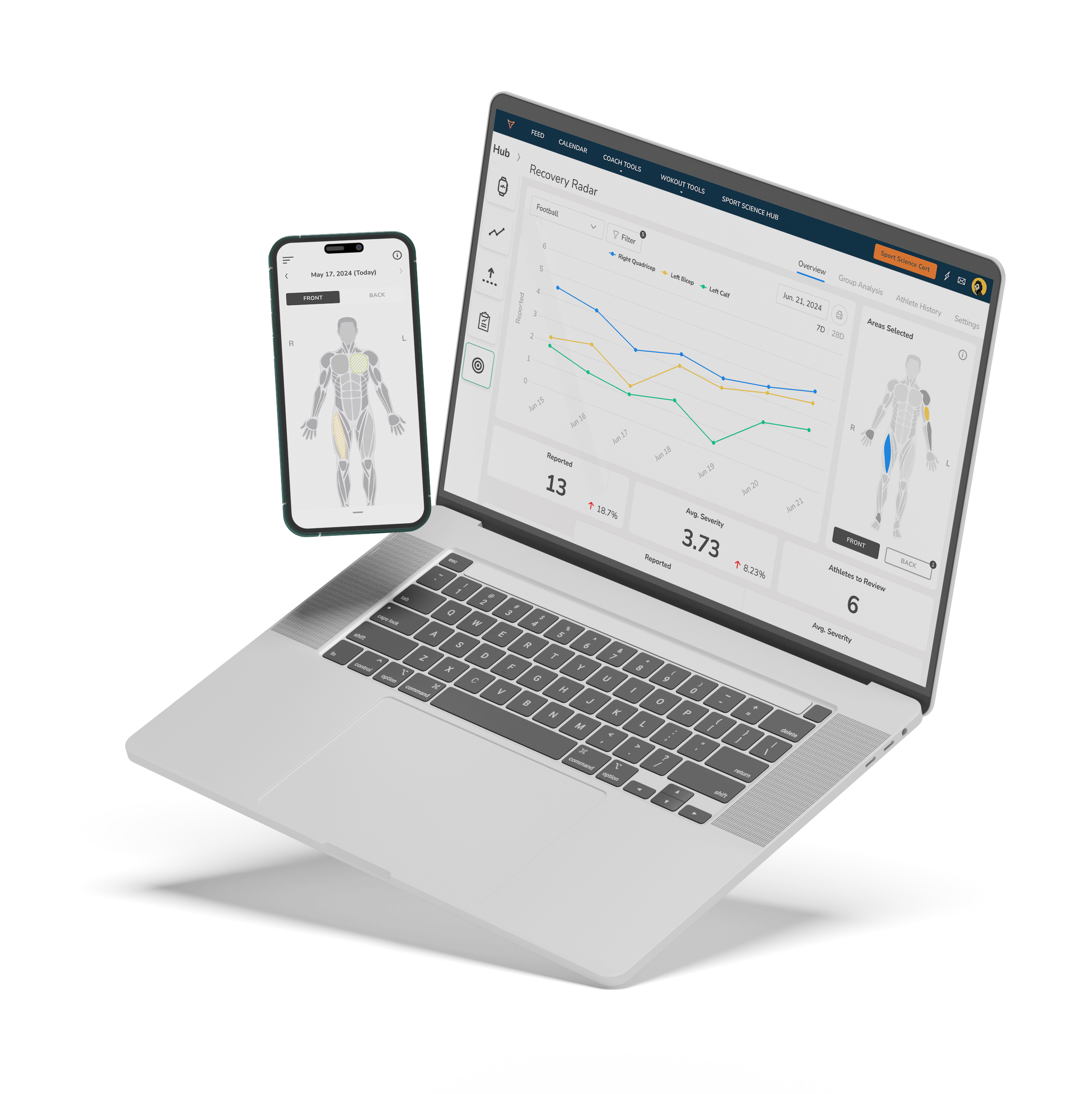 The Body Heat Map was designed to give coaches and sports scientists real-time, visual insight into athlete soreness, injury, and recovery trends across teams. Available on both web and mobile, this feature turns subjective feedback into actionable data, mapped directly to the human body.